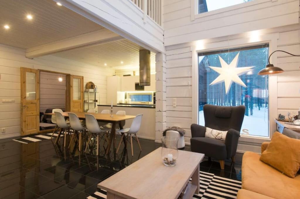 Ačkoli dny trávíte uprostřed drsné severské přírody, zázemí zůstává komfortní a útulné. Moderní chata s panoramatickými okny vám umožní sledovat hvězdnou oblohu i polární záři přímo z postele.